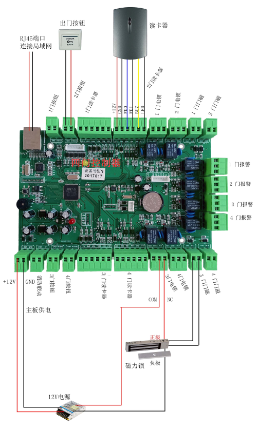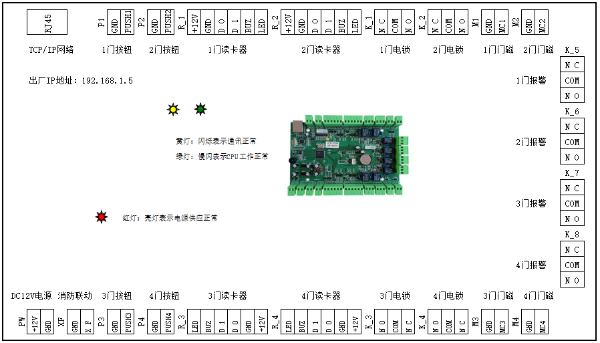 | 2、輸入/輸出(I/O)配置豐富:輸入INPUT共17路:出門按鈕4路,消防聯(lián)動1路,門磁檢測4路,紅外報警4路,可擴(kuò)展防撬報警等輸入3路;輸出OUT共16路:電鎖繼電器4路,報警繼電器4路,WG讀卡器4套8路聲光響應(yīng)輸出(聲音BUZ和光亮LED響應(yīng)三極管輸出2*4=8路)。 |